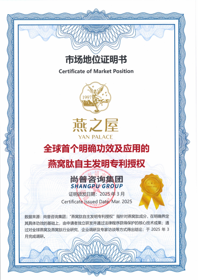 圖:燕之屋獲得“全球首個(gè)明確功效及應(yīng)用的燕窩肽自主發(fā)明專利授權(quán)”認(rèn)證